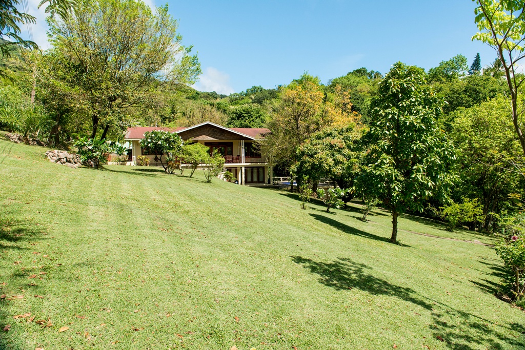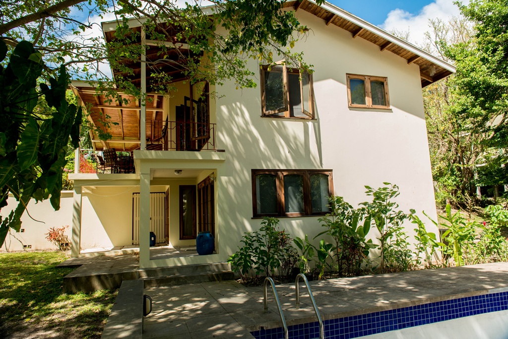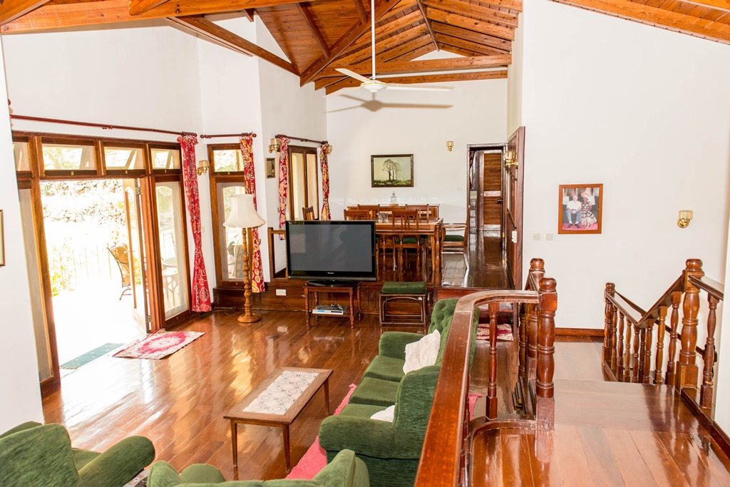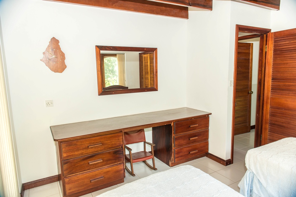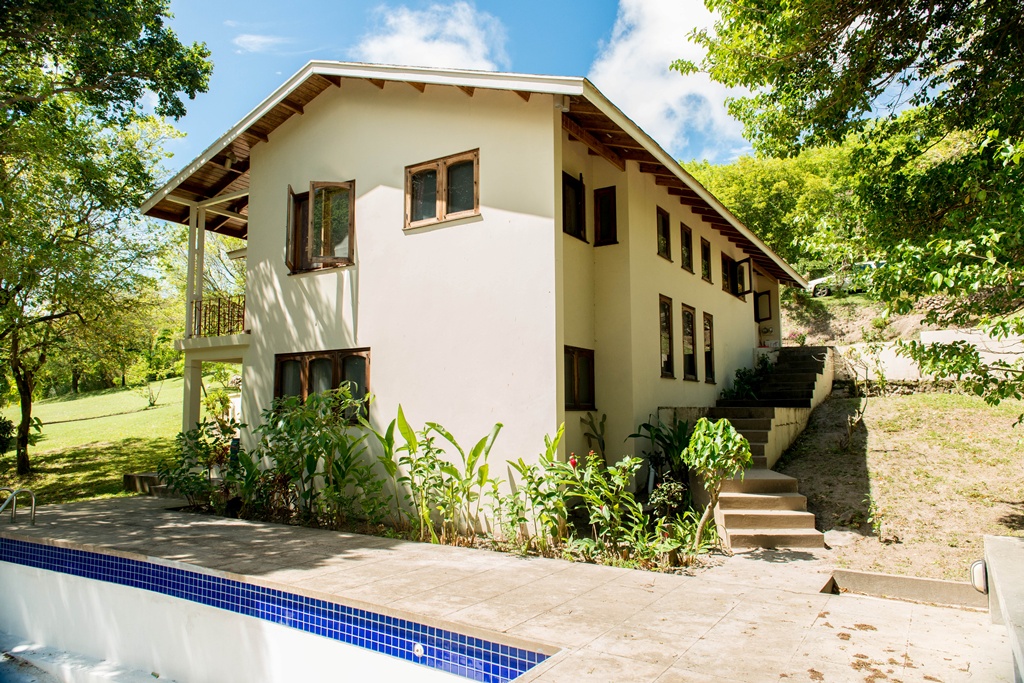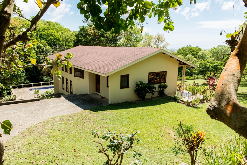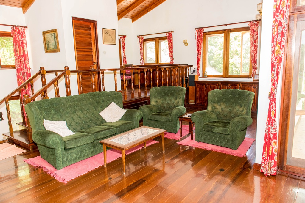 Mango View villa is simply enchanting with its exotic wooden trims and finishes! Greenheart wood flooring, mahogany doors, casement windows, railings, cabinets and trim provide a warm feeling which flows all through this lovely home. One bedroom is located on the upper main level accompanied by an en-suite bathroom, along with a modest kitchen finished with mahogany paneled cabinets. Adjacent to the kitchen is an open plan formal dining area which steps down to the large living/family room. The western facing veranda presents a lovely view of beautifully landscaped rolling grass lawns and the Caribbean Sea in the distance. Mahogany clad stair threads lead from the main level down to the lower level which has 2 more bedrooms and a shared bathroom. On the outside a few steps lead from the lower level patio to a large swimming pool with a wrap around pool deck. Mango view is tastefully enhanced with lovely mahogany furniture and fully equipped high quality appliances. The villa is centered on approximately 0.60 acres providing Owners with a very private and peaceful setting.